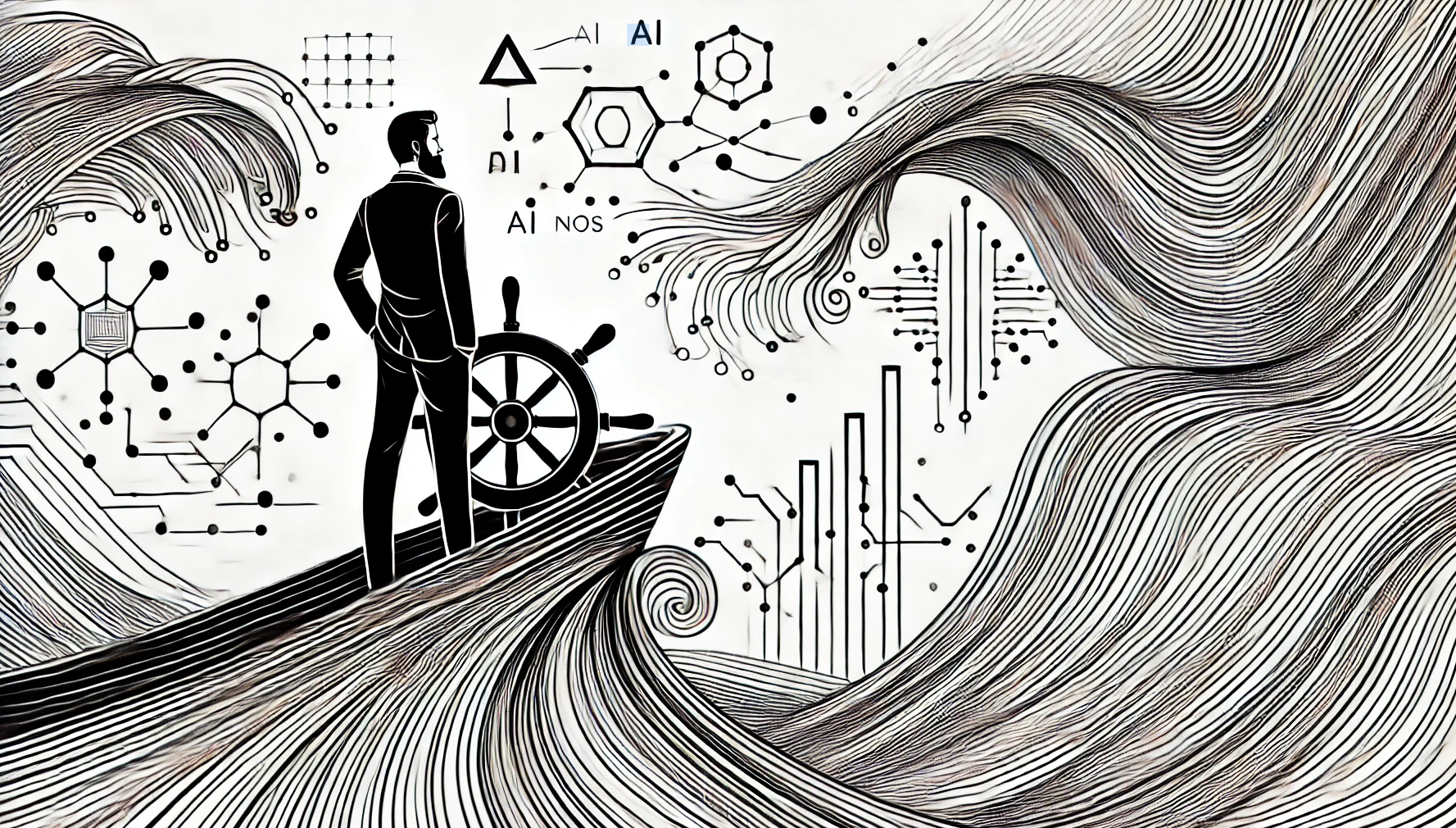 Navigating through intersecting waves, symbolizing convergent disruptions, with AI-inspired digital elements